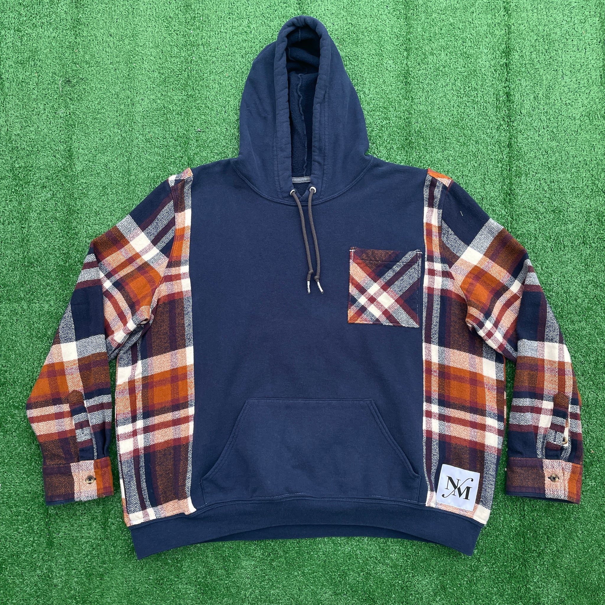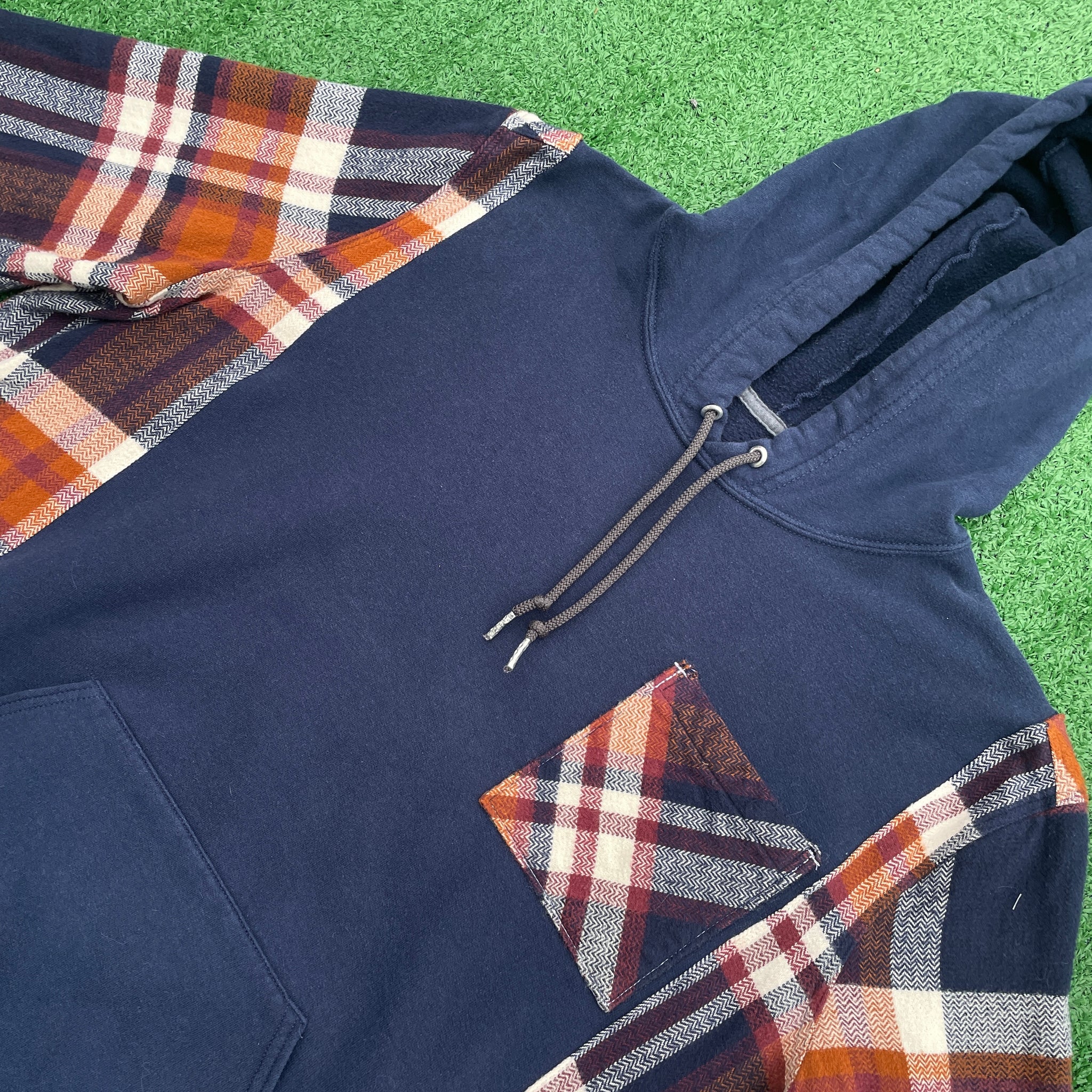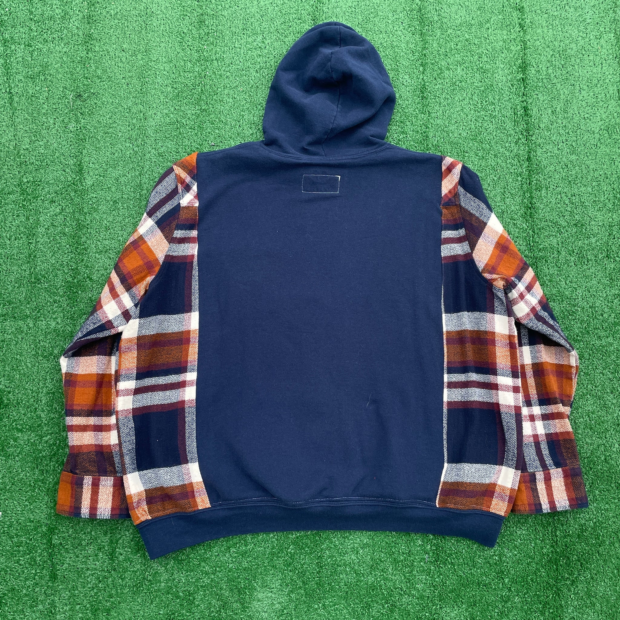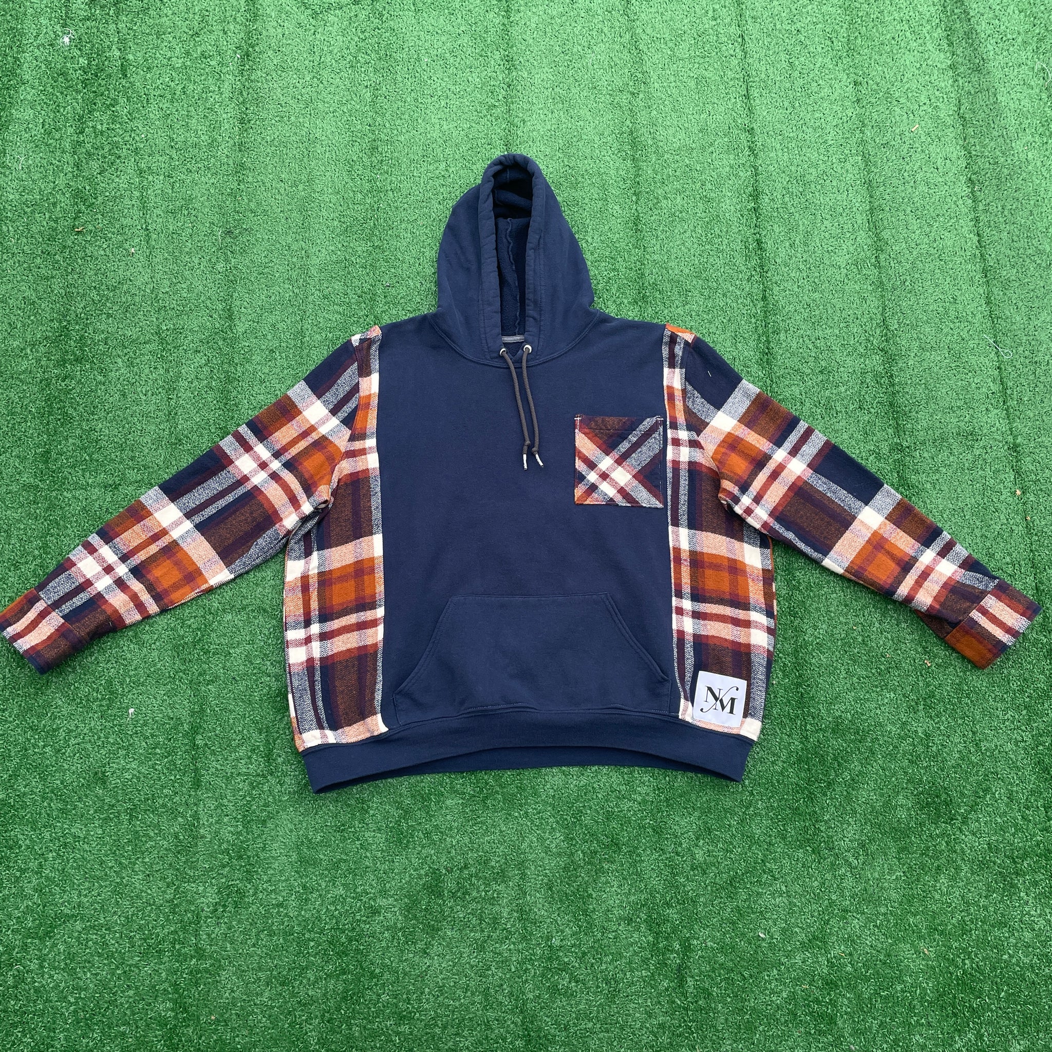 This 1 of 1 design was created from a hand selected thrifted classic cotton sweatshirt and a flannel that were all deconstructed and combined into this new sustainable design to created a unique twist on a classic pieces. Triple stitched with overlock and top-stitch accent.