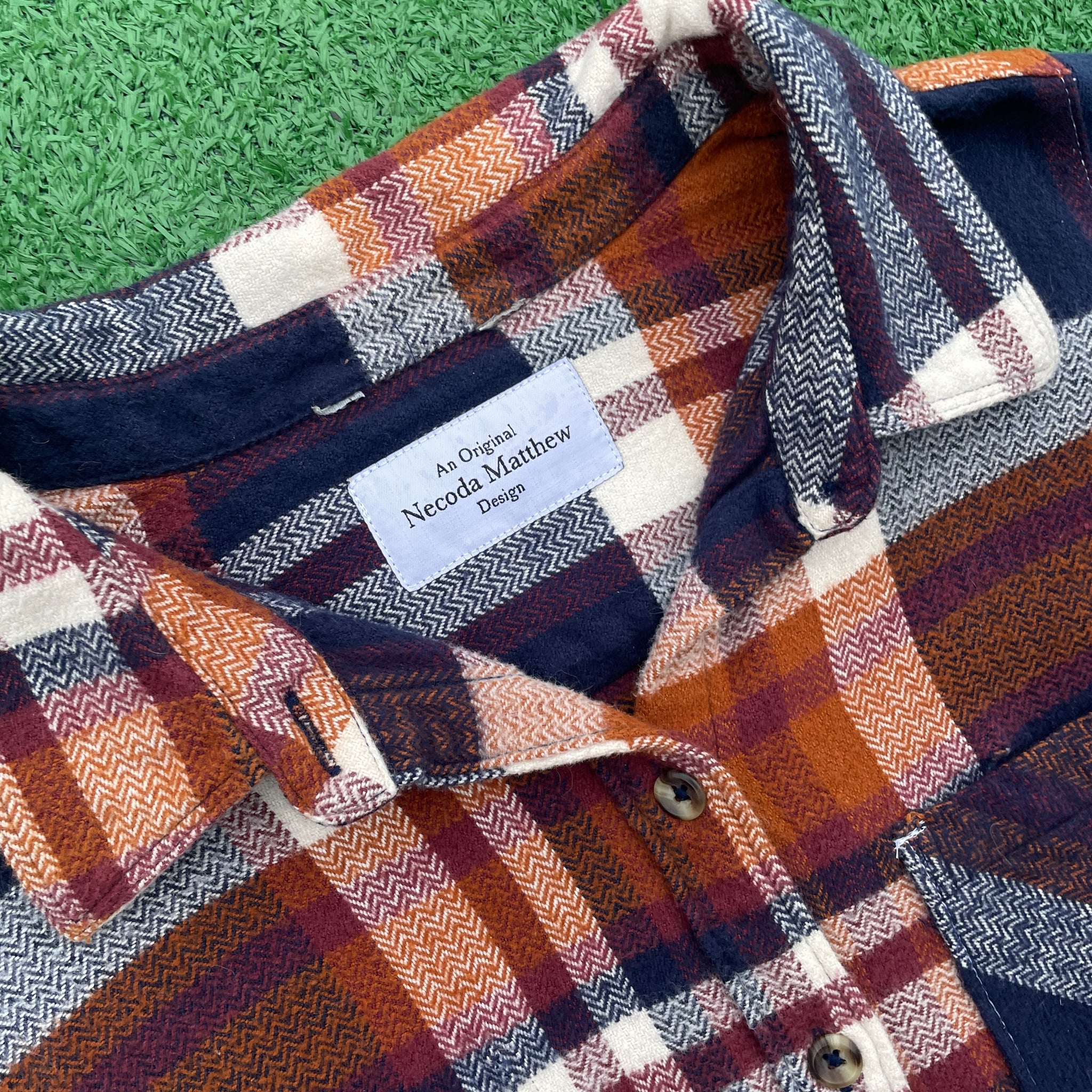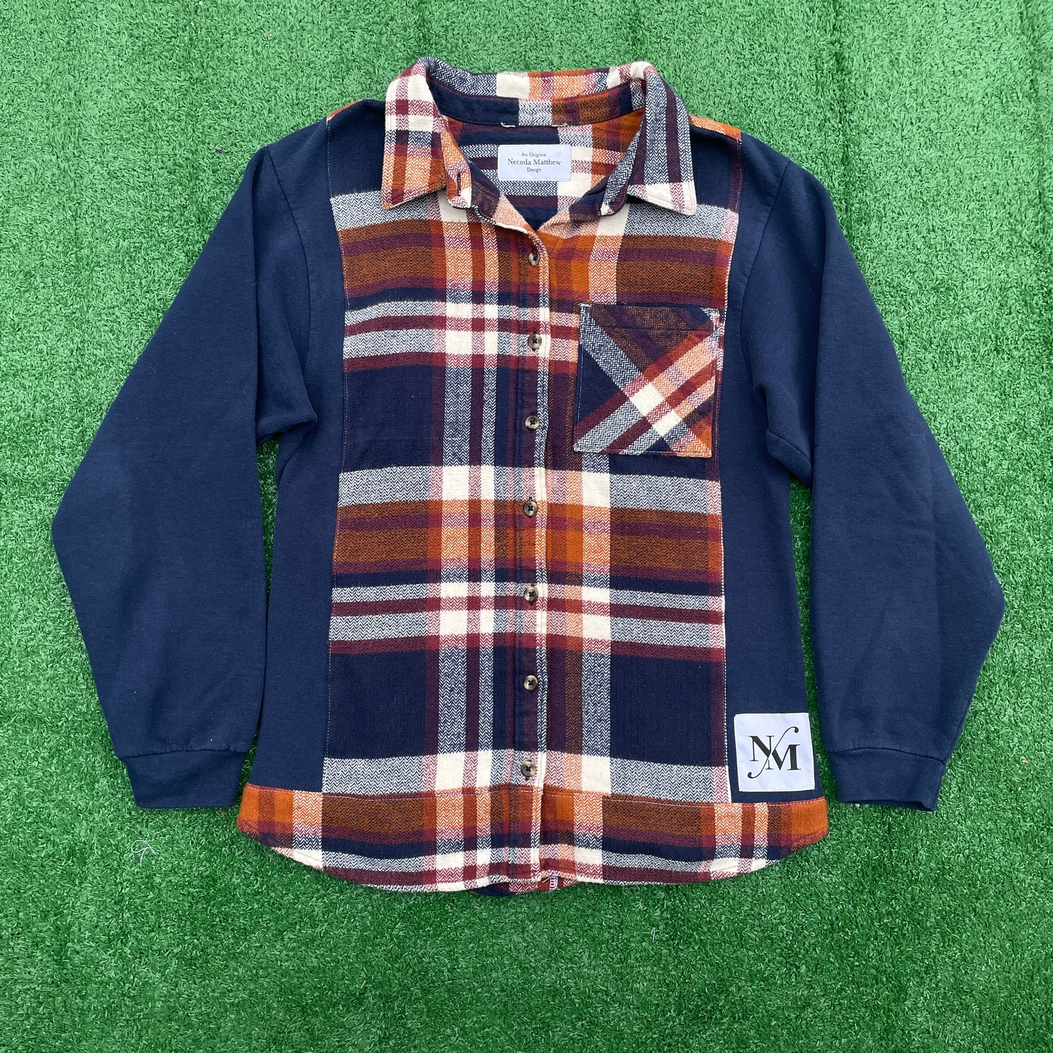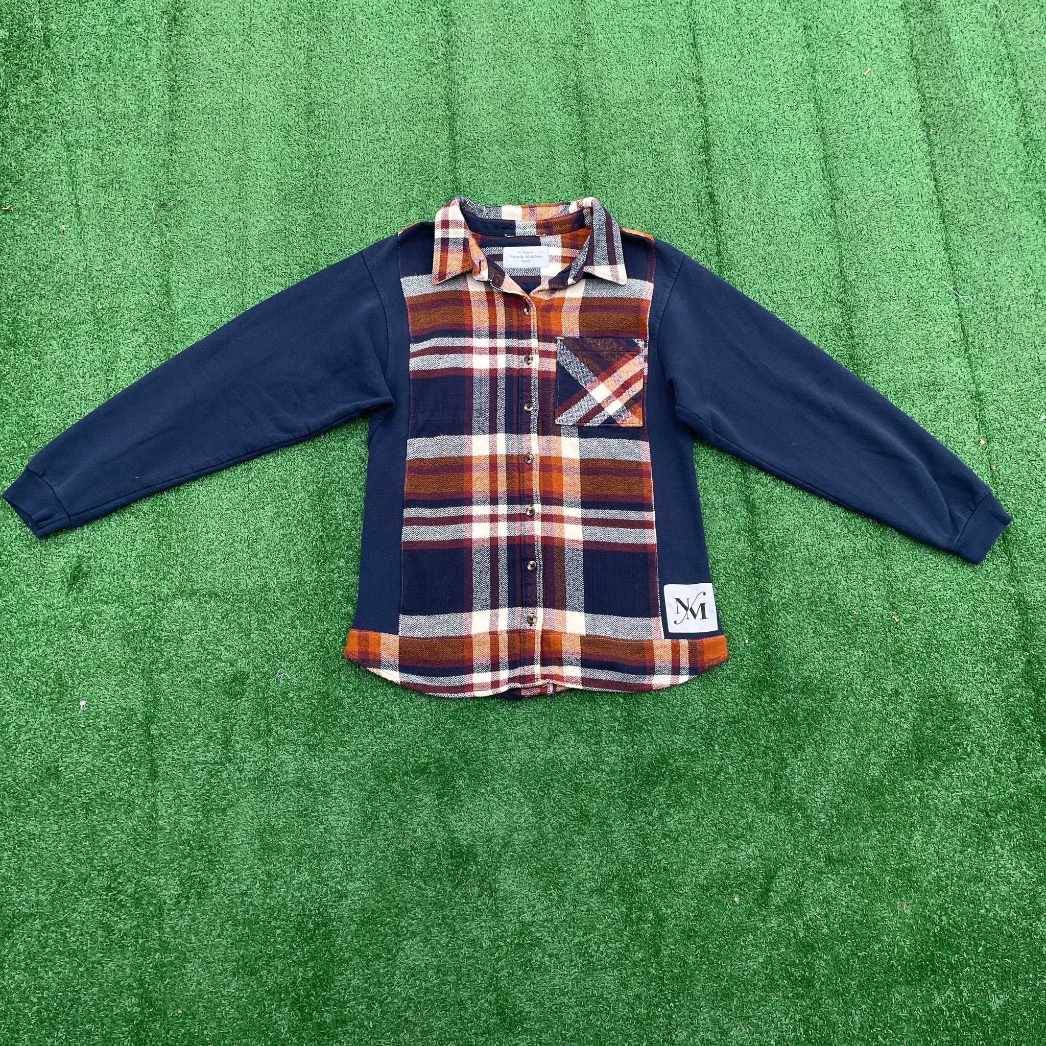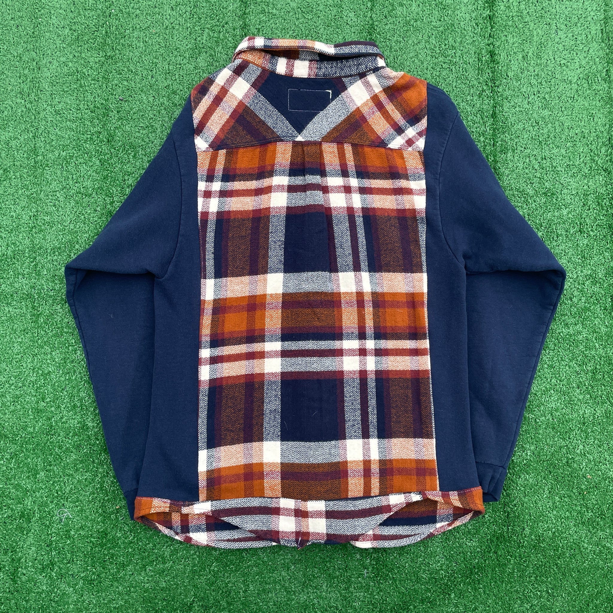 This 1 of 1 design was created from a hand selected thrifted classic cotton sweatshirt and a flannel that were all deconstructed and combined into this new sustainable design to created a unique twist on a classic pieces. Triple stitched with overlock and top-stitch accent.